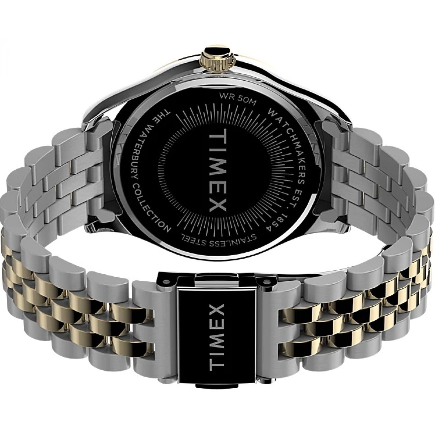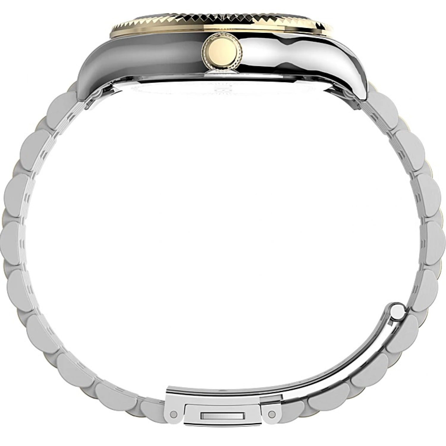 Часы Timex TW2V45600 из коллекции Waterbury Legacy — это элегантный женский аксессуар, который сочетает классический дизайн и современные технологии. Корпус диаметром 34 мм и браслет выполнены из нержавеющей стали с БезельБезельВнешний ободок, закрепляющий стекло. В спортивных часах так называется поворотное кольцо с делениями на циферблате, выполняет роль таймера – замеряет отрезки времени на шкале. Неподвижный безель – элемент декора. Однонаправленно вращающийся безель на дайверских часах позволяет фиксировать моменты погружения и выныривания на поверхность. с PVD-покрытиемPVDУльтратонкое покрытие наносится в технике вакуумного напыления, сочетает в себе нитрид титана особой прочности со слоем золота или оксида хрома. Несёт в себе декоративную или защитную функцию., что придаёт часам изысканный вид. Белый циферблат с римскими цифрами и стрелками защищён минеральным стекломМинеральное стеклоМинеральное стекло представляет собой искусственно выращенный минерал кварца. Такое стекло отличается особой устойчивостью к повреждениям и царапинам. Уступает по некоторым качествам сапфировому стеклу., устойчивым к царапинам, а так же украшен кристаллами.