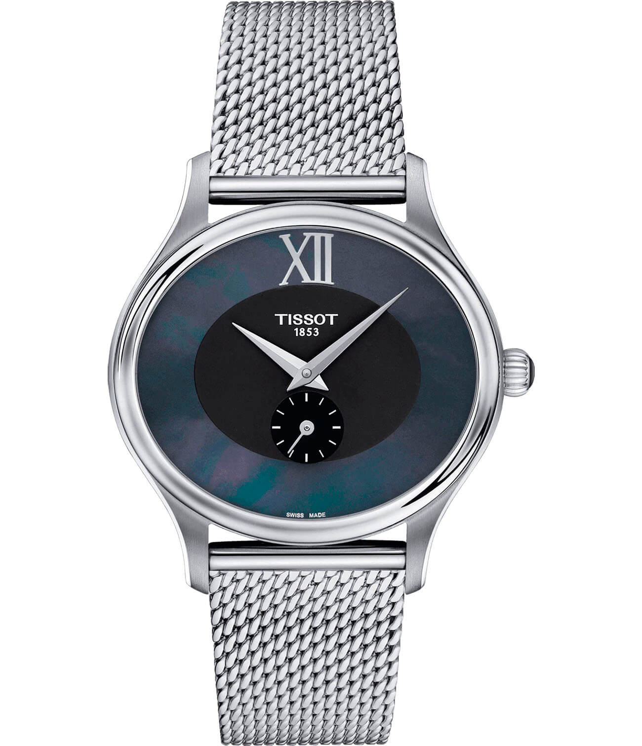 Необычный циферблат с перламутровой вставкой по ободку не имеет часовых меток, кроме крупной римской цифры 12. Такое исполнение красиво сочетается с браслетом из нержавеющей стали 316L миланского плетения. Кварцевый калибр ETA 980.153 с 11 камнями в механизме. Отдельный малый счётчик секунд. Сапфировое стекло. Индикатор EOLEOLПредставляет собой систему, уведомляющую владельца часов о необходимости замены элемента питания. За 2 недели до полного разряда батарейки секундная стрелка перестаёт ходить чётко и начинает перепрыгивать на 3-4 деления.. Габариты: 28 x 31,4 x 6,6 мм.