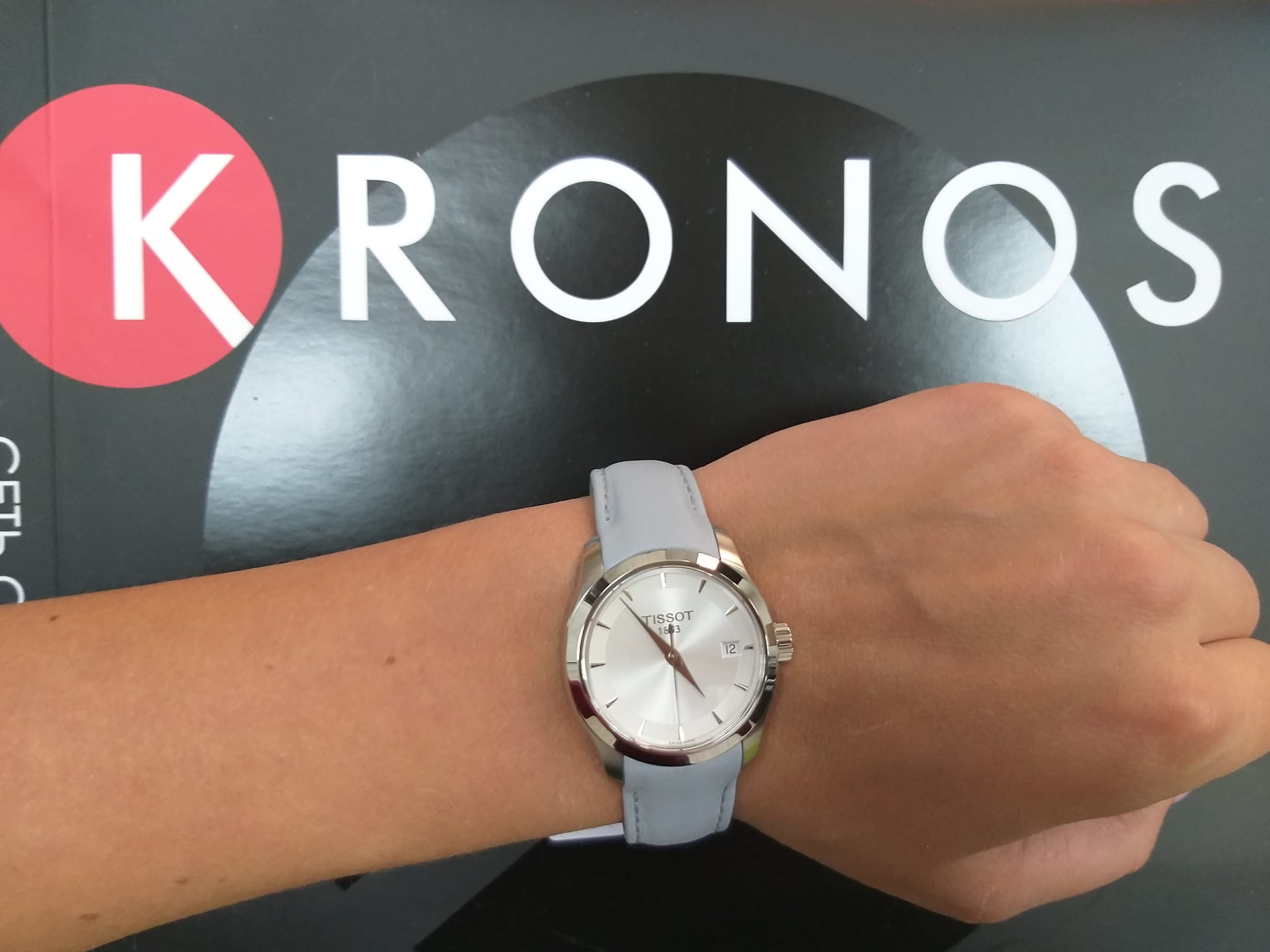 Компактная модель красиво смотрится на запястье, утончённости придаёт лаконичный кожаный ремешок нежно-голубого оттенка. Серебристый циферблат в минималистичном дизайне отличается элегантностью, ничто не мешает просмотру показателей. Высокую точность хода обеспечивается швейцарским кварцевым калибром ETA F05.111. Надёжное стекло из сапфира. Водостойкость до 10 бар. Корпус из нержавеющей стали 316L. . Апертура даты. Габариты: 32 x 32 x 8,1 мм.