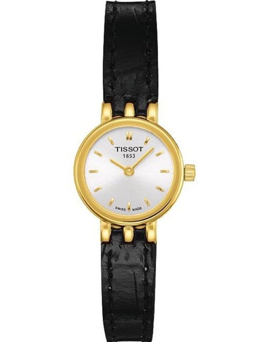 TISSOT Lovely Quartz - женские кварцевые наручные часы Корпус этих часов небольшого размера (195 мм) и выполнен из нержавеющей стали L316 с PVD-покрытием цвета желтого золота Модель имеет устойчивое к царапинам сапфировое стекло, ремешок из натуральной кожи черного цвета, белый циферблат Калибр механизма: ETA 901001 Класс водозащиты: 30 м / 3 АТМ (защита от брызг и случайных капель)
