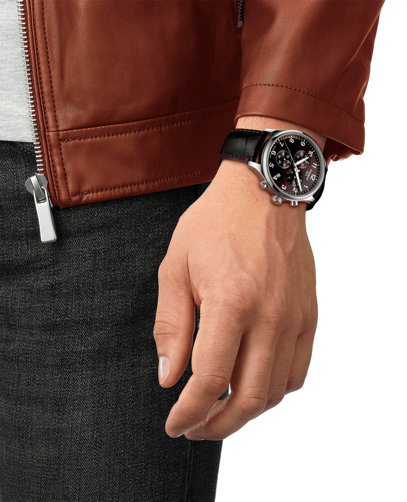 Брендовый аксессуар в классическом стиле и спортивными деталями в виде отдельных окошек хронографаХронографФункция позволяет измерять отрезки времени с особой точностью: часы, минуты, секунды. Верным признаком хронографа является наличие на циферблате 3 дополнительных окошек-счётчиков. никогда не утратит актуальности. Надёжный корпус из хирургической стали 316L защищает кварцевый калибр ETA G10.212. Сапфировое стекло устойчиво к образованию царапин и отметин. Водонепроницаемость при давлении 10 бар. Коричневый ремешок из натуральной кожи с рисунком под кожу крокодила. Люминесцентная подсветкаЛюминесцентное покрытиеПозволяет считывать показания времени в темноте. Производители наносят на стрелки, часовые индексы, безель или поверхность циферблата светонакопительный состав, дающий холодное свечение.. Секундомер, отображение числа. Габариты: 45 x 45 x 11 мм.