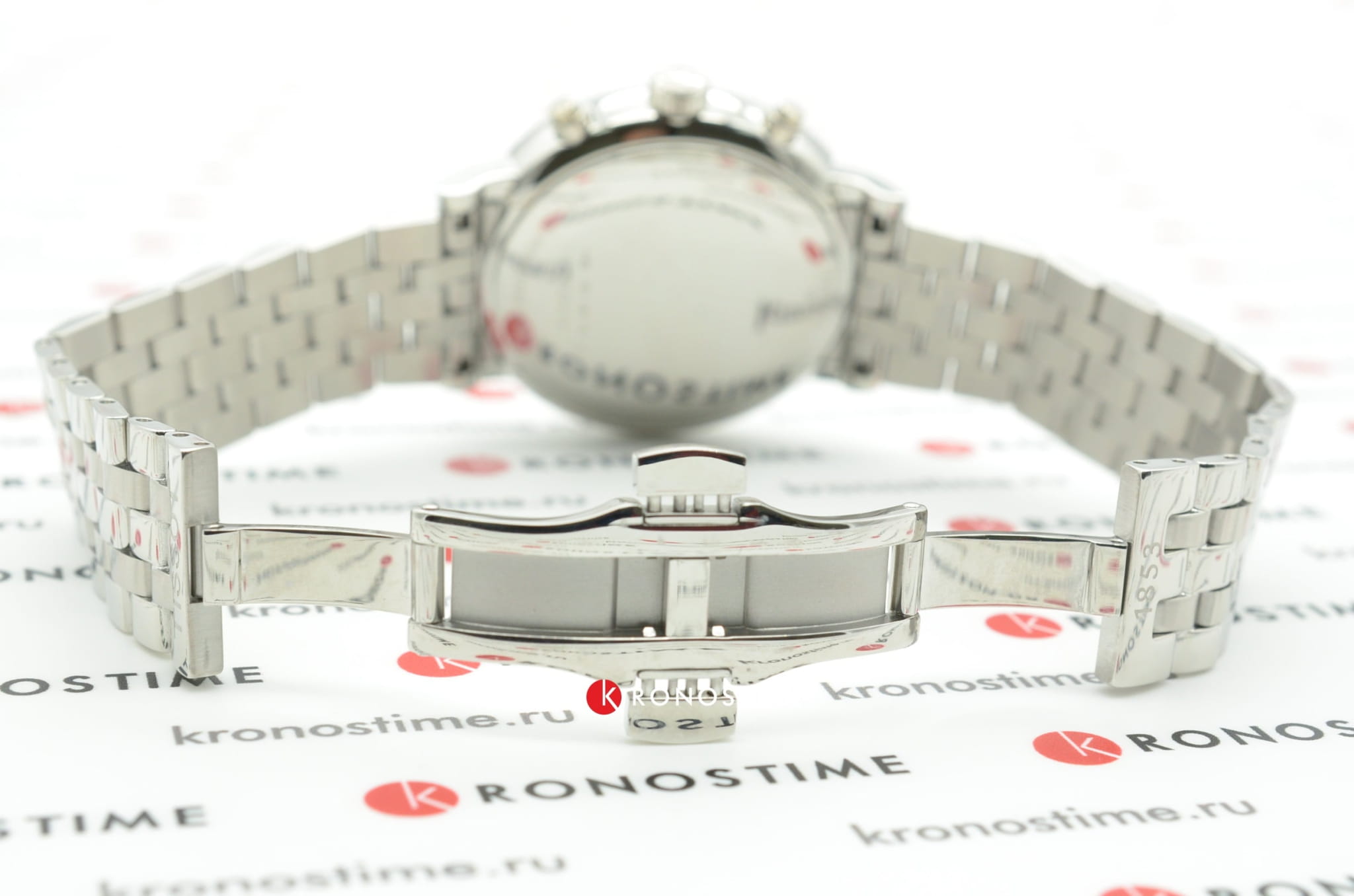 Модель не отличается богатым декором или броскими деталями, её особенность заключается в наличии полезного функционала и минималистичном строгом дизайне. Наручные часы привлекают серебристыми переливами корпуса и браслета, циферблат было решено оставить в белом цвете. Они комплектуются высокоточным кварцевым механизмом ETA G10.212. Сохранение водонепроницаемости при давлении до 50 бар. Надёжное сапфировое стекло. ХронографХронографФункция позволяет измерять отрезки времени с особой точностью: часы, минуты, секунды. Верным признаком хронографа является наличие на циферблате 3 дополнительных окошек-счётчиков., секундомер, отображение даты. . Габариты: 41 x 41 x 10,2 мм.