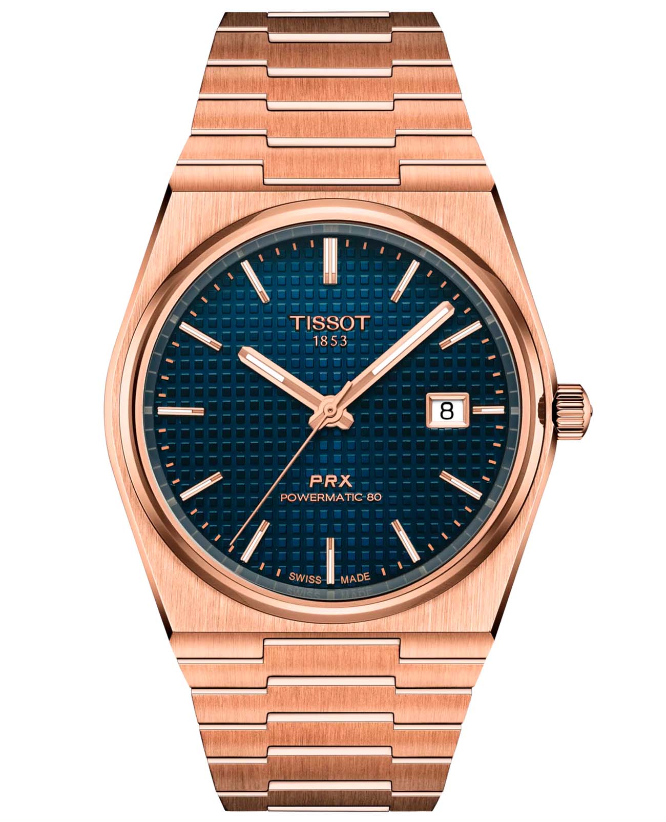 Tissot PRX Powermatic 80 T137.407.33.041.00 — современная и стильная интерпретация культового дизайна 70-х годов с акцентом на премиальную отделку и автоматическую механику. Корпус диаметром 40 мм выполнен из нержавеющей стали 316L с изысканным розовым PVD-покрытиемPVDУльтратонкое покрытие наносится в технике вакуумного напыления, сочетает в себе нитрид титана особой прочности со слоем золота или оксида хрома. Несёт в себе декоративную или защитную функцию.. Циферблат защищён сапфировым стекломСапфировое стеклоПрочный и надёжный материал из кристалла сапфира синтетического происхождения, характеризующийся особой твёрдостью и устойчивостью к царапинам и повреждениям. с антибликовым покрытиемАнтибликовое покрытиеСлой оксида металла в 0,13-0,3 микрон, благодаря которому стекло часов не бликует и не отражает свет. Антибликовое покрытие уменьшает отражение света в 10 раз, обеспечивая отличную читаемость показателей циферблата., обеспечивающим стойкость к царапинам и отличную читаемость. Тёмно-синий циферблат с текстурой «вафля» оформлен в фирменном стиле PRX и дополнен золотистыми стрелками и индексами с покрытием Super-LumiNova®Люминесцентное покрытиеПозволяет считывать показания времени в темноте. Производители наносят на стрелки, часовые индексы, безель или поверхность циферблата светонакопительный состав, дающий холодное свечение.. Окно даты расположено на позиции «3 часа». Внутри установлен автоматический механизм Powermatic 80 SiliciumPowermatic 80 SiliciumМеханизм обладает самой высокой точностью хода за всю историю Tissot. Дополняется уникальной кремниевой спиралью, минимизирующей воздействие магнитных полей и перепада температур. Сохраняется запас хода до 80 часов благодаря удлиненной заводной пружине и снижению трения в системе спуска. с запасом хода до 80 часов и спиралью из антимагнитного сплава Nivachron™Nivachron™Специально разработанный инновационный сплав Nivachron™ повышает устойчивость часов к воздействию магнитных полей.. Модель укомплектована интегрированным браслетом с розовым PVD-покрытиемPVDУльтратонкое покрытие наносится в технике вакуумного напыления, сочетает в себе нитрид титана особой прочности со слоем золота или оксида хрома. Несёт в себе декоративную или защитную функцию. и застёжкой 'бабочка'Застёжка "бабочка"Такой вид застёжки дополняется предохранителями, помогающими избежать случайного раскрытия браслета. Обладают изящным исполнением. , снабжённой кнопками и системой быстрой замены. Водонепроницаемость 100 метров делает эту модель практичным выбором для повседневной жизни и выходов в свет. PRX T137.407.33.041.00 — баланс технического совершенства и эстетической утончённости.