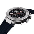Высокая точность хода обусловлена наличием швейцарского кварцевого калибра ETA G10.212. Сапфировое стеклоСапфировое стеклоПрочный и надёжный материал из кристалла сапфира синтетического происхождения, характеризующийся особой твёрдостью и устойчивостью к царапинам и повреждениям. с антибликовым покрытием. Каучуковый ремешок. Люминесцентная подсветкаЛюминесцентное покрытиеПозволяет считывать показания времени в темноте. Производители наносят на стрелки, часовые индексы, безель или поверхность циферблата светонакопительный состав, дающий холодное свечение. стрелок и меток. Корпус из нержавеющей стали. Водостойкость 100 метров. Секундомер, тахиметрТахиметрРазмеченная шкала, располагается на ободке или безеле часов. Тахиметр позволяет рассчитать скорость на определённом участке пути, расстояние измеряется в километрах или милях., индикация числа. Габариты: 45 x 45 x 11,8 мм. Ограниченная серия из 8000 штук.