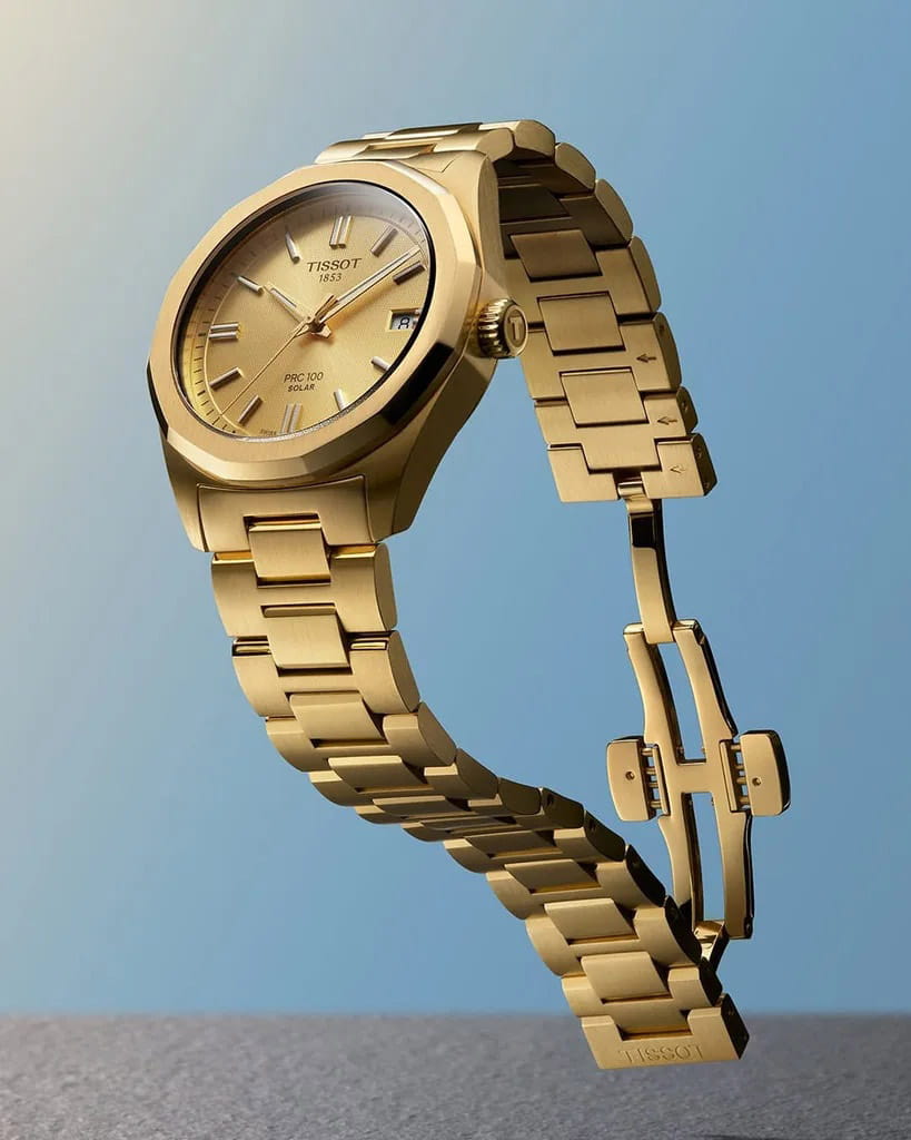 Женские кварцевые часы Tissot PRC 100 T1518223302100 — это стильный аксессуар, сочетающий в себе элегантность классики и передовые технологии. Модель выполнена в круглой форме из нержавеющей стали 316L с PVD-покрытиемPVDУльтратонкое покрытие наносится в технике вакуумного напыления, сочетает в себе нитрид титана особой прочности со слоем золота или оксида хрома. Несёт в себе декоративную или защитную функцию. цвета жёлтого золота, что придаёт ей благородный внешний вид и устойчивость к царапинам. Циферблат цвета шампань дополнен индексами, а его поверхность защищена сапфировым стекломСапфировое стеклоПрочный и надёжный материал из кристалла сапфира синтетического происхождения, характеризующийся особой твёрдостью и устойчивостью к царапинам и повреждениям., устойчивым к повреждениям. Стрелки и метки имеют люминесцентное покрытиеЛюминесцентное покрытиеПозволяет считывать показания времени в темноте. Производители наносят на стрелки, часовые индексы, безель или поверхность циферблата светонакопительный состав, дающий холодное свечение. Super-LumiNova®, обеспечивающее отличную читаемость даже в условиях слабого освещения. Часы оснащены солнечным кварцевым механизмом швейцарского производства, который обеспечивает точную работу и минимальное обслуживание. Браслет из нержавеющей стали с покрытием цвета жёлтого золота оснащён застёжкой-бабочкойЗастёжка "бабочка"Такой вид застёжки дополняется предохранителями, помогающими избежать случайного раскрытия браслета. Обладают изящным исполнением. , обеспечивающей комфорт и надёжную фиксацию на запястье. Ремешок является быстросменным, что позволяет легко менять его по желанию. Водонепроницаемость позволяет использовать модель при плавании и других водных активностях без глубокого погружения. Гарантия 3 года подтверждает качество и долговечность изделия. Эти часы станут универсальным аксессуаром для тех, кто ценит сочетание стиля, функциональности и швейцарского мастерства — идеальный выбор для повседневной носки и активного образа жизни.