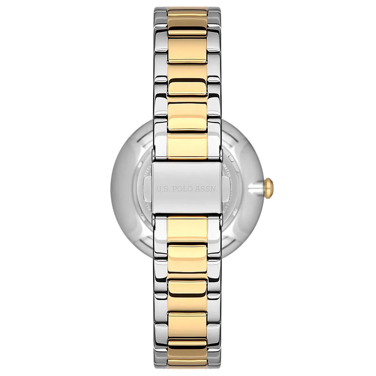 Женские элегантные часы U.S. Polo Assn. Stile USPA2015-07 кварцевый механизм с высокой точностью. Минеральное стеклоМинеральное стеклоМинеральное стекло представляет собой искусственно выращенный минерал кварца. Такое стекло отличается особой устойчивостью к повреждениям и царапинам. Уступает по некоторым качествам сапфировому стеклу. устойчивое к появлению царапин, обладающее высокой прозрачностью. Изысканный корпус изготовлен из нержавеющей стали. Лаконичные золотистые центральные часовая, минутная и секундная стрелки. Класс водозащиты: 30 метров, позволит защитить корпус от случайных брызг или капель дождя. Стальной браслет с IP-покрытиемIP-покрытиеМетод ионного напыления. Демонстрирует повышенную устойчивость к истиранию, окислению и химическим веществам. Под воздействием высокого давления и температуры около 1500°C молекулы металла надёжно соединяются с частицами корпуса часов. с раскладной застёжкойРаскладная застёжкаТакой тип застёжки используется только на браслетах из металла. Она никогда не раскрывается полностью, происходит разделение на 2 и более частей. Раскладывающая застёжка снизит вероятность потери часов к минимуму. обеспечивает комфорт и удобство в использовании, добавляя завершающий штрих к этому стильному аксессуару. Циферблат подчёркивает изысканный характер часов, создавая универсальный образ, подходящий как для повседневных ситуаций, так и для особых случаев.