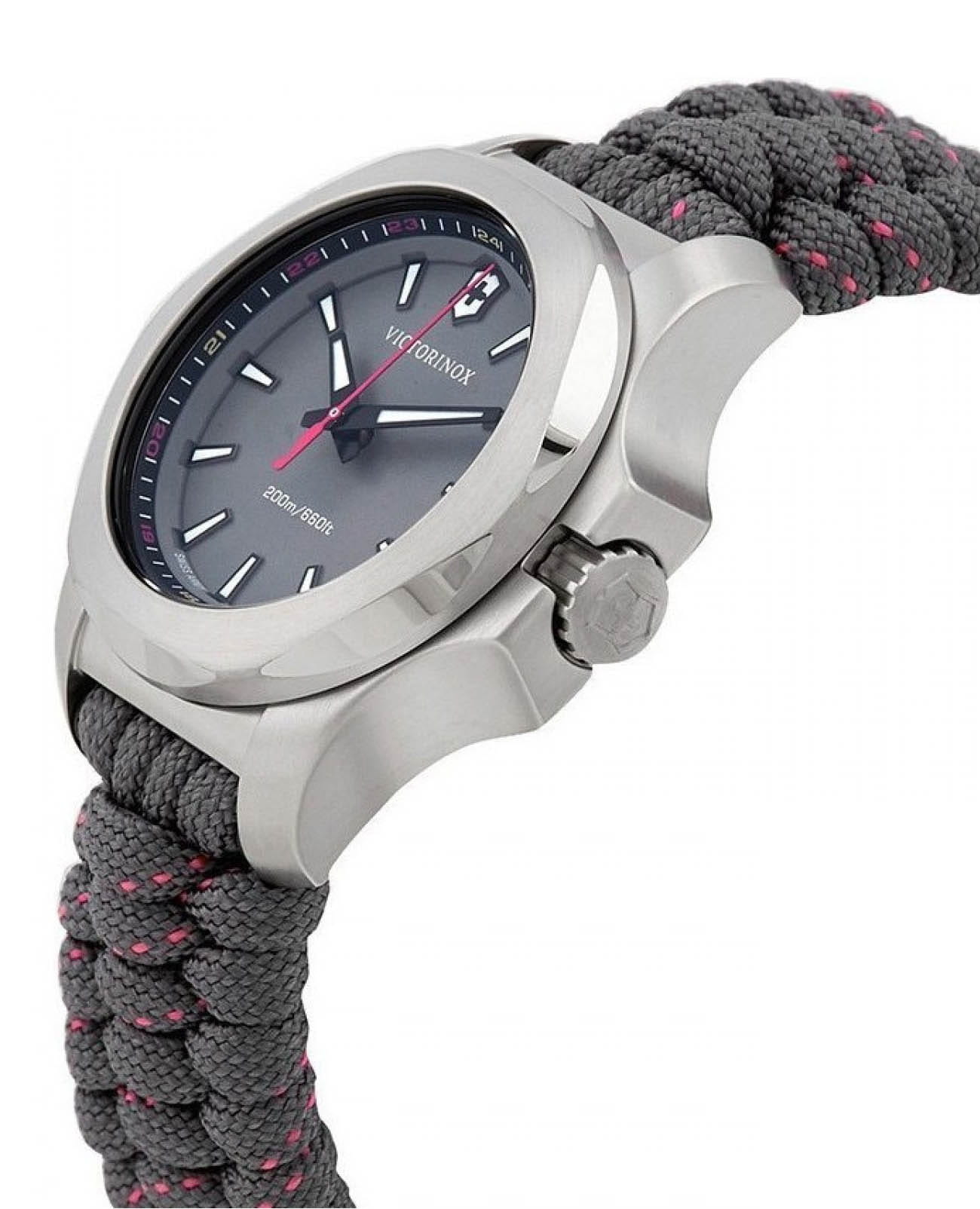 Женские швейцарские часы Victorinox I.N.O.X. V 241771. Сапфировое стеклоСапфировое стеклоПрочный и надёжный материал из кристалла сапфира синтетического происхождения, характеризующийся особой твёрдостью и устойчивостью к царапинам и повреждениям. с трёхслойным антибликовым покрытием. Корпус часов выполнен из нержавеющей стали 316L. Ремешок изготовлен из плетенной паракордовой стропы, длиной 2,5 метра и способной выдержать 250 кг. Влагозащита: 200 метров, позволит плавать, нырять и заниматься другими водными видами спорта. Стрелки и метки с люминесцентным покрытиемЛюминесцентное покрытиеПозволяет считывать показания времени в темноте. Производители наносят на стрелки, часовые индексы, безель или поверхность циферблата светонакопительный состав, дающий холодное свечение.. 12 и 24-часовой формат времени.