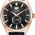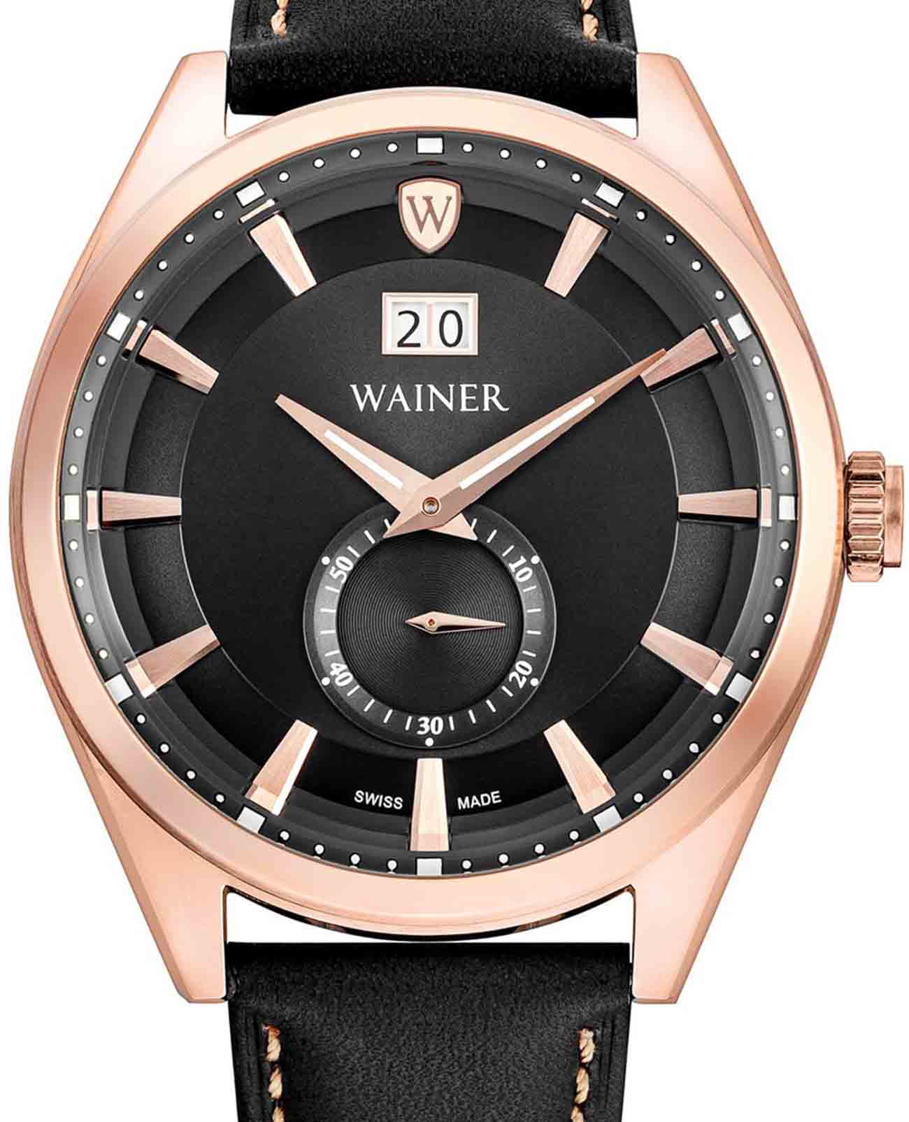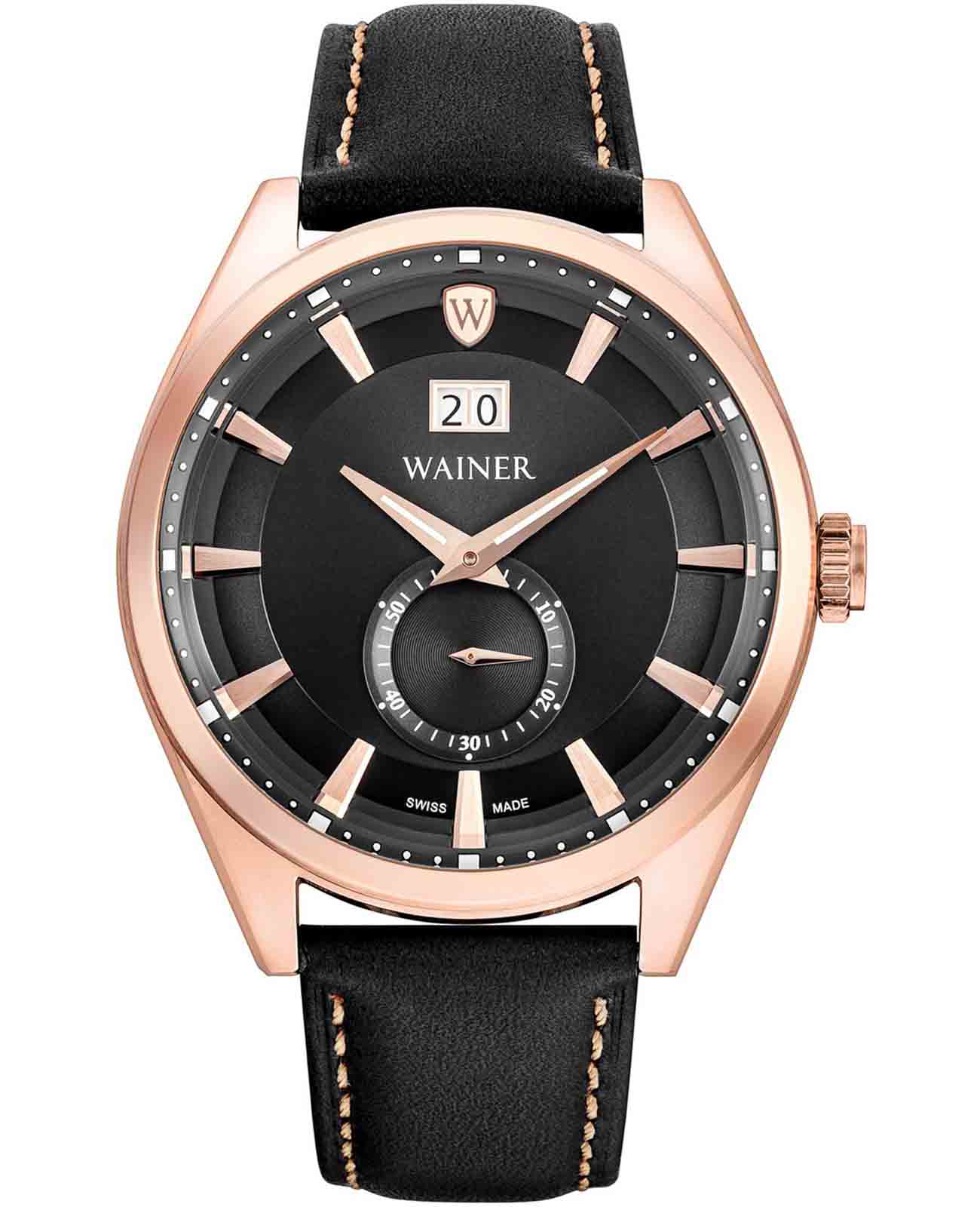 Швейцарские мужские кварцевые часы Wainer WA.17100-C с круглым корпусом из нержавеющей стали 316L с PVD-покрытиемPVDУльтратонкое покрытие наносится в технике вакуумного напыления, сочетает в себе нитрид титана особой прочности со слоем золота или оксида хрома. Несёт в себе декоративную или защитную функцию. диаметром 46 мм и толщиной 11.5 мм станут идеальным аксессуаром на каждый день. Черный циферблат, выполненный по технологии Sunray (солнечные лучи), защищен устойчивым к царапинам минеральным стекломМинеральное стеклоМинеральное стекло представляет собой искусственно выращенный минерал кварца. Такое стекло отличается особой устойчивостью к повреждениям и царапинам. Уступает по некоторым качествам сапфировому стеклу. с сапфировым покрытием и украшен фирменным логотипом Wainer в положении 12 часов. Метки в виде штрихов и вынесенная секундная стрелка на отдельном циферблате обеспечивают удобство считывания времени. Окошко даты расположено в положении 12 часов. Рифленая заводная головка добавляет практичности модели. Часы имеют класс водозащиты 50 метров, позволит защитить корпус от случайных брызг или капель дождя. Модель комплектуется кожаным ремешком шириной 22-20 мм, что обеспечивает комфортное ношение благодаря весу всего 79 грамм. Элегантный дизайн и надежное качество швейцарского производства делают эти часы превосходным выбором для современного мужчины.