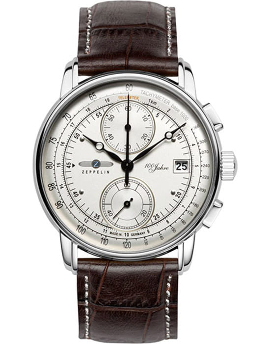 Стильные мужские часы Zeppelin Zep-86701 из коллекции 100 Years Zeppelin станут идеальным аксессуаром для современного ритма жизни, сочетая в себе функциональность и элегантный дизайн. Часы оснащены функцией хронографаХронографФункция позволяет измерять отрезки времени с особой точностью: часы, минуты, секунды. Верным признаком хронографа является наличие на циферблате 3 дополнительных окошек-счётчиков. с секундомеромСекундомерСекундоме́р — прибор, способный измерять интервалы времени с точностью до долей секунды. и шкалой тахиметраТахиметрРазмеченная шкала, располагается на ободке или безеле часов. Тахиметр позволяет рассчитать скорость на определённом участке пути, расстояние измеряется в километрах или милях., а также телеметрической шкалой для измерения расстояния до события по времени задержки сигнала. Механизм — кварцевый, калибр Miyota 6S11 , обеспечивающий точность и надёжность хода. Циферблат серебристого цвета с окошком даты добавляет практичности в повседневной носке. Корпус изготовлен из стали, стекло — минеральноеМинеральное стеклоМинеральное стекло представляет собой искусственно выращенный минерал кварца. Такое стекло отличается особой устойчивостью к повреждениям и царапинам. Уступает по некоторым качествам сапфировому стеклу., водозащита — 50WR , что позволяет использовать часы в условиях случайных брызг воды. Часы дополнены кожаным ремешком с классической застёжкой, что создаёт завершённый и строгий образ. Габаритные размеры: диаметр 42 мм, толщина 12 мм. Это стильный и многофункциональный аксессуар для уверенных в себе людей, ценящих качество, технологии и эстетику.